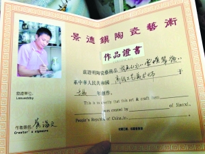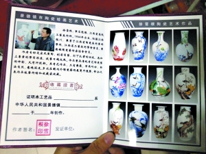 在滨江东路一家景德镇瓷器展销会店铺,只见一个青瓷花瓶旁放着一份封皮皱皱巴巴的“收藏证书”。记者发现,这些证书印刷粗糙,多为相纸打印。证书左侧一般印着“名家”简介,右侧则是一幅或多幅瓷器作品的照片。记者在网上搜索,发现一些作品确实能与这些名家的作品相对应,但却无法辨别真伪。(北京会展公司 http://www.zcv.net.cn/ )