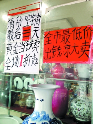 半小时内,只有记者一人光临该店。记者询问一个标价为7800元的青花瓷的售价,店主表示2000元可以拿走,转了一圈返回再问,他又表示可以再打5折。